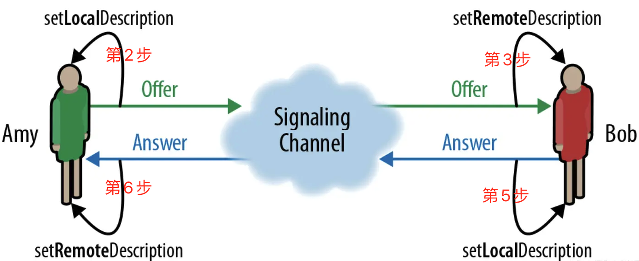 这里双方做的事就是存下自己的信息,然后发送和接收对方的Offer或Answer。步骤如下图所示。
